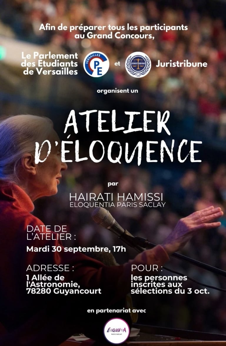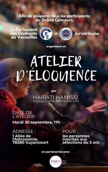 Cet atelier sera assuré par Hairati Hamissi, étudiante en Master 1 Droit des affaires et membre d'Eloquentia Paris-Saclay.