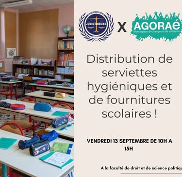 Pour la rentrée 2024-2025, l'association Juristribune, en partenariat avec l'Agoraé, organise une distribution solidaire de fournitures scolaires et de serviettes hygiéniques. Cette initiative vise à alléger les charges financières des étudiants et à répondre à leurs besoins essentiels en matière d’éducation et de santé.