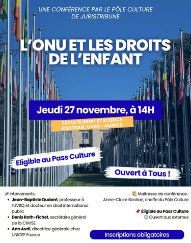 La conférence JURISTRIBUNE est ouverte aux étudiants comme aux externes souhaitant approfondir leur réflexion autour de la protection internationale des droits de l’enfant et du rôle des institutions onusiennes.
