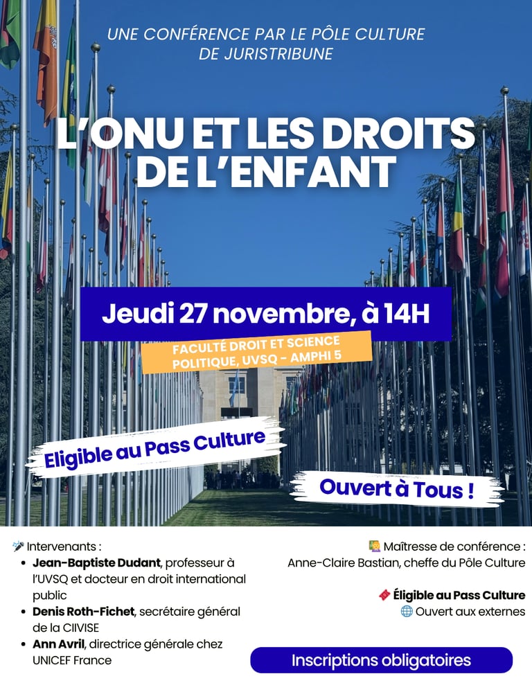 Juristribune a le plaisir de vous inviter à assister à la conférence consacrée à l’ONU et aux droits de l’enfant, qui se tiendra le jeudi 27 novembre à 14h à la Faculté de Droit et de Science Politique, située 3 rue de la Division Leclerc, 78280 Guyancourt, dans l’amphithéâtre 5.