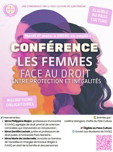 Cette rencontre, éligible au Pass Culture, est ouverte à l’ensemble des étudiants de l’UVSQ souhaitant approfondir leur réflexion sur les enjeux contemporains relatifs aux droits des femmes et à leur protection juridique, tant au niveau national qu’international.